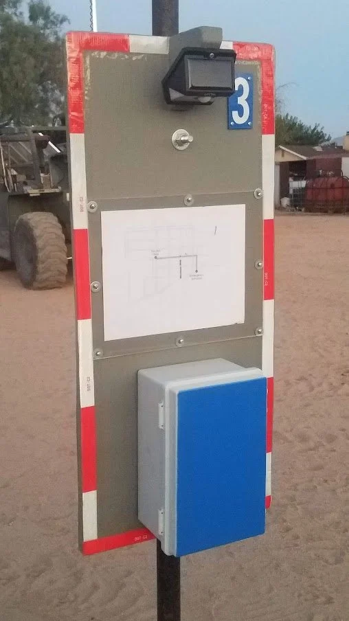 Look for a tall pole with a blue light on top.